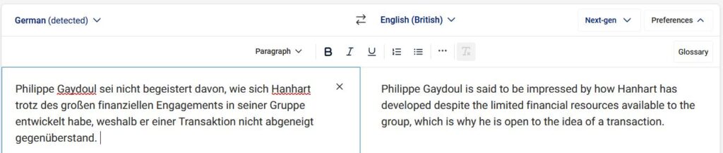Hier sind einige Beispiele für DeepL-Fehler, die an einem typischen Tag entdeckt wurden (alle Beispiele stammen aus November 2024):